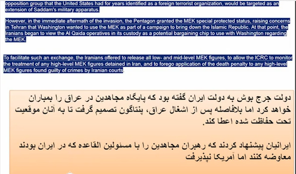 سند:” دولت جورج بوش به دولت ايران گفته بود كه پايگاه مجاهدين در عراق را بمباران خواهد كرد. امّا بلافاصله پنتاگون تصميم گرفت تابه آنان موقعيت تحت حفاظت اعطا كند.