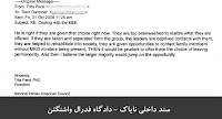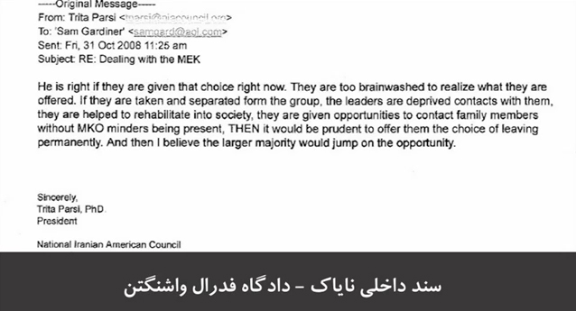 در ايميلي كه تريتا پارسي در 19 ژانويه 2003 يعني دو ماه قبل از حمله به عراق براي گري سيك از لابيست هاي طرفدار سازش با رژيم ايران فرستاده به تلاشهاي باب ني براي نگهداشتن مجاهدين در ليست تروريستي اشاره مي كنه در يك سند ديگر (سند داخلي ناياك –دادگاه فدرال واشنگتن)